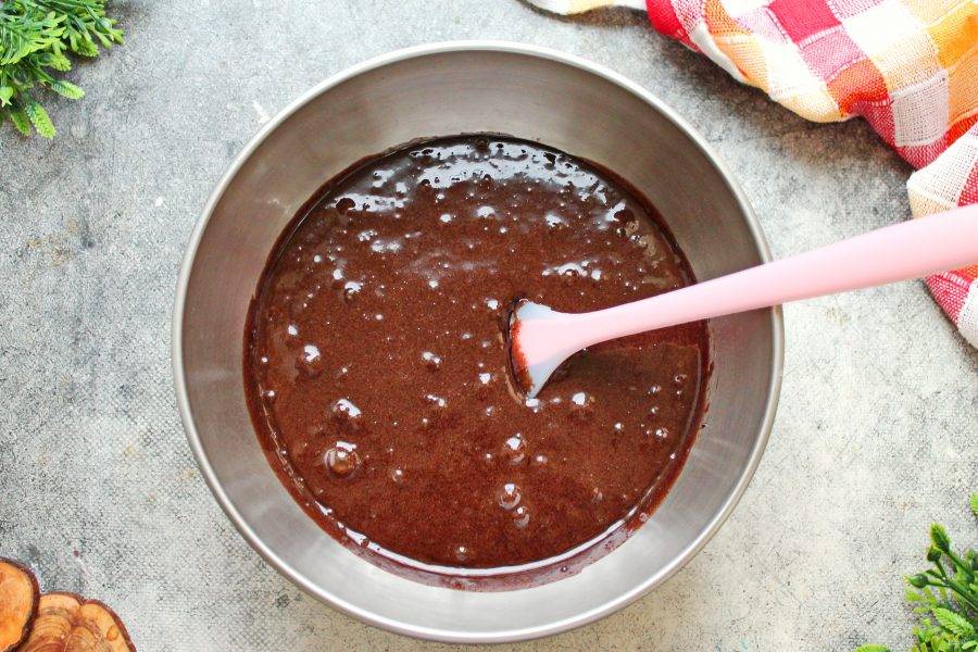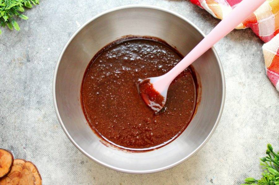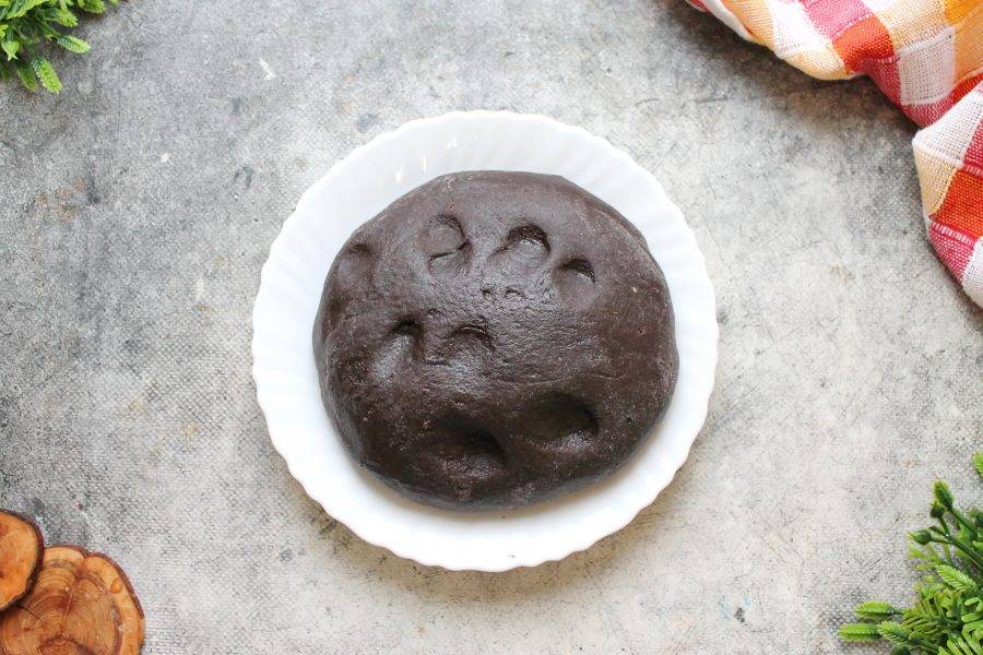 Просейте муку и частями вмешивайте в шоколадную массу. Перемешивайте сначала лопаткой, так как масса первое время будет горячей. Затем переложите тесто на стол и замесите мягкое, чуть липкое тесто. Муки может понадобиться чуть больше, так как она у всех разная. Добавляйте муку постепенно, чтобы не забить тесто. Учтите, что после остывания оно станет плотнее. Положите готовое тесто в пакет и уберите в холодильник минимум на 8 часов.