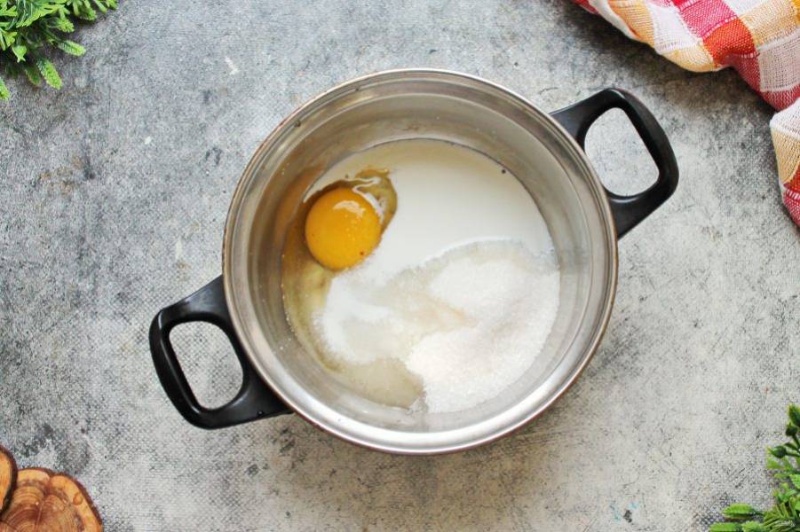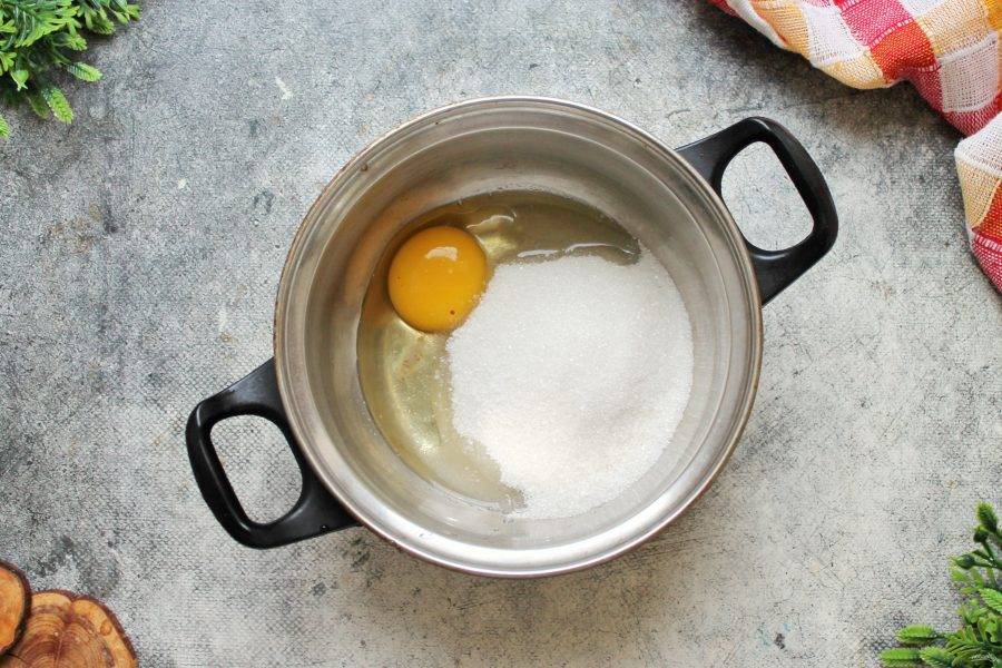 В кастрюлю с толстым дном вбейте яйцо, всыпьте сахар и добавьте ванильный сахар.