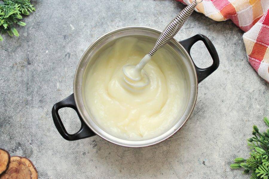 Остальное молоко доведите до кипения и тонкой струйкой, все время, мешая, влейте в кастрюлю. Все хорошо перемешайте до однородной массы.