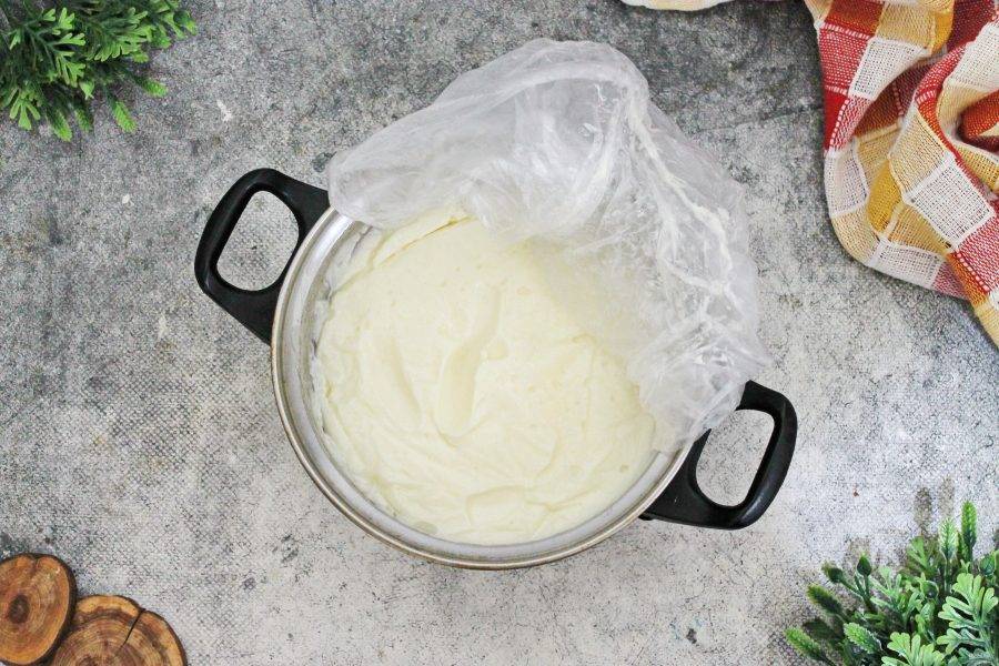 Положите в кастрюлю сметану, тщательно перемешайте до однородности. Верните кастрюлю на медленный огонь и варите массу, мешая, до загущения. После того как крем начал пыхтеть, отсчитайте 20 секунд и снимите кастрюлю с огня. Во время варки мешайте крем постоянно, иначе он может пригореть и тогда уже его ничем не исправить. Выложите поверх крема в контакт пленку и уберите в холодное место на 8 часов, для его стабилизации.