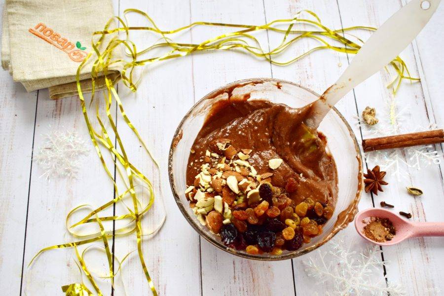 Муку, разрыхлитель, какао-порошок и специи перемешайте до однородности. Смешайте частями с яично-масляной массой. Добавьте измельченные орехи и сухофрукты, перемешайте.