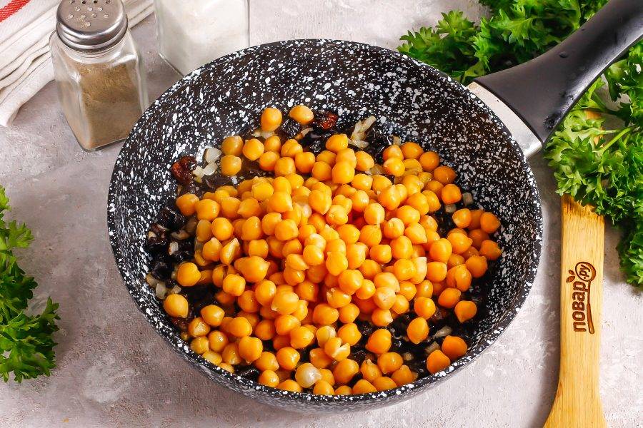 Откиньте нут на дуршлаг и добавьте в сковороду к луку. Кстати, воду, в которой варился нут, можно не выливать, из нее получается отличный веганский майонез.