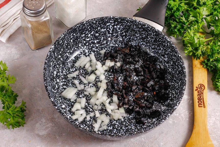 Лук очистите от кожуры и промойте в воде. Чернослив не замачивайте заранее, просто промойте. Нарежьте лук и чернослив мелкими кубиками. Обжарьте в сковороде на растительном масле примерно 3-5 минут до румяности лука.