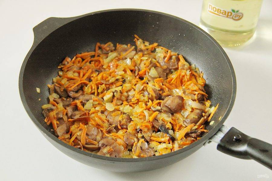 Добавьте тертую морковь и протушите все вместе еще несколько минут.