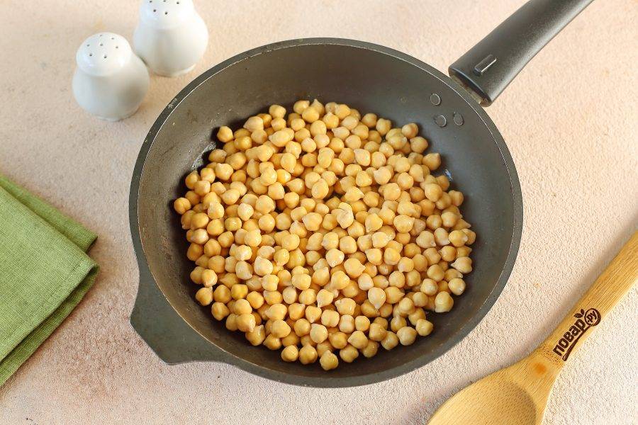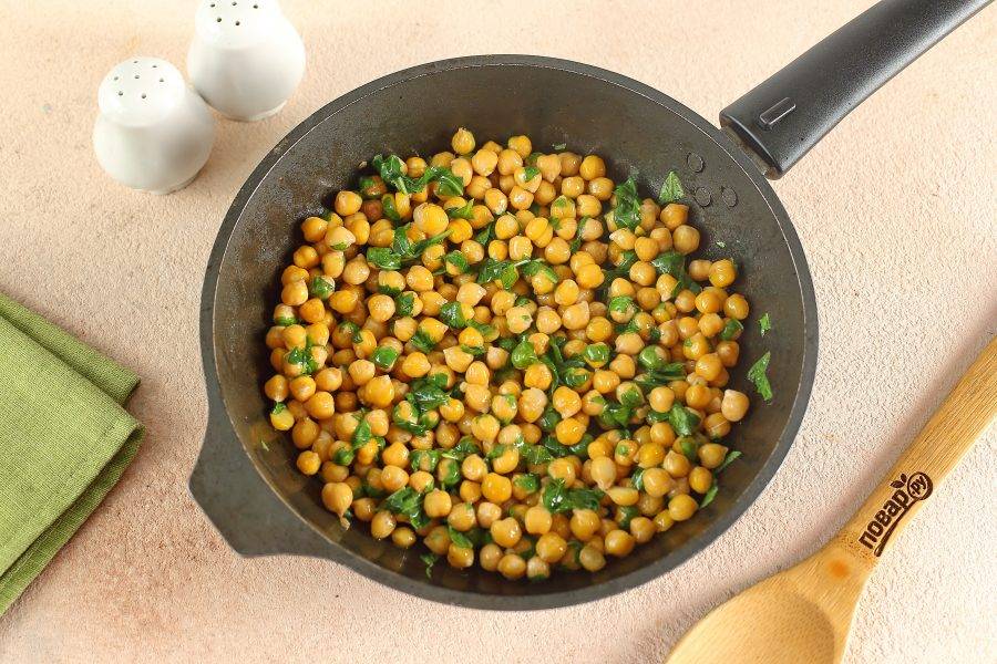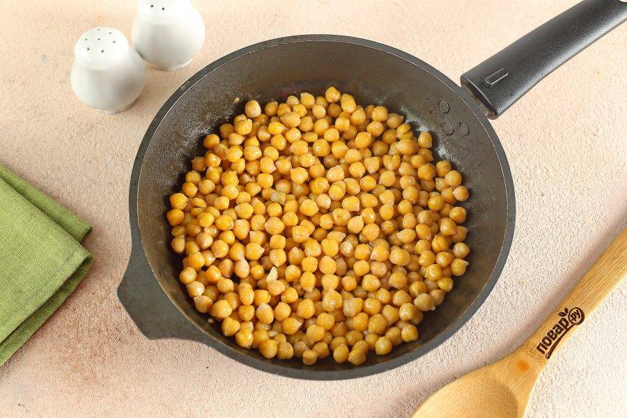 Влейте воду и тушите нут под крышкой, периодически помешивая, до полного испарения жидкости. Нут должен слегка подрумяниться и полностью приготовиться.