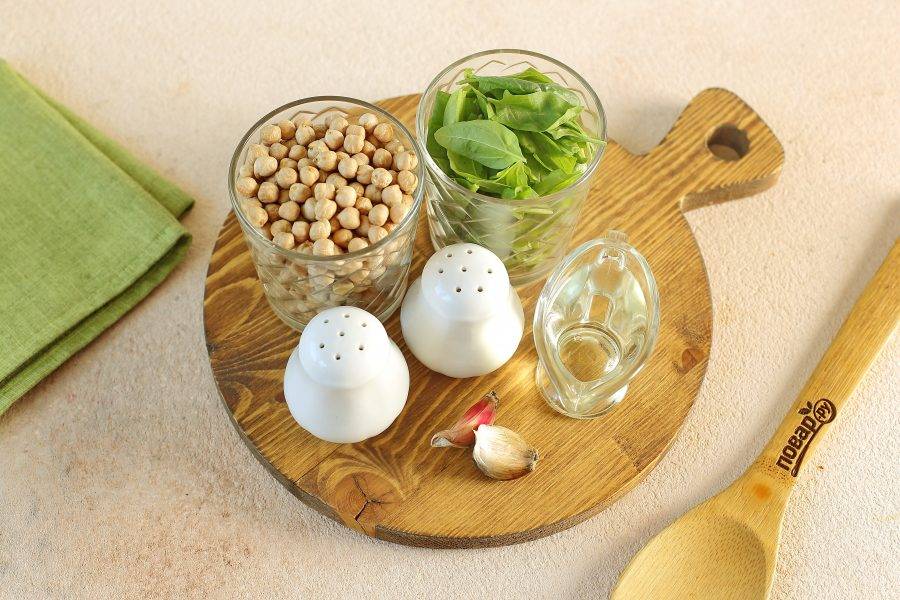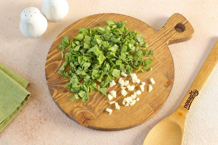 Шпинат промойте, обсушите и измельчите ножом. Чеснок мелко порубите.