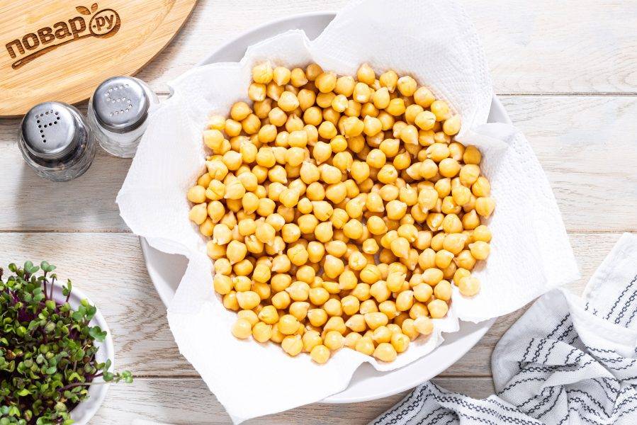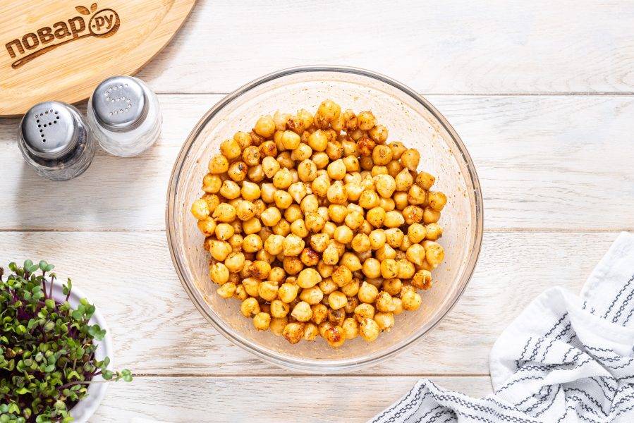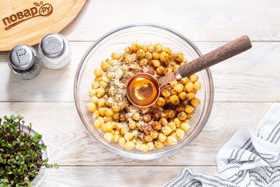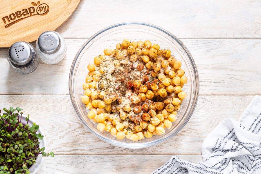 Переложите просушенный нут в глубокую миску. Добавьте соль и все специи.