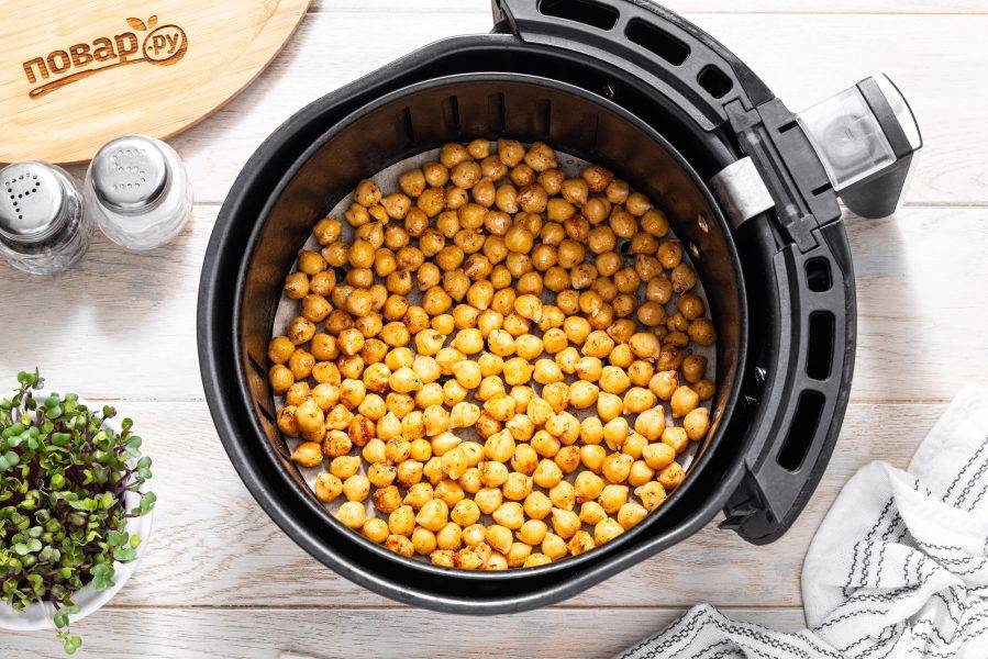 Выложите нут в один слой в чашу аэрогриля. Готовьте 15 минут при температуре 200 градусов.