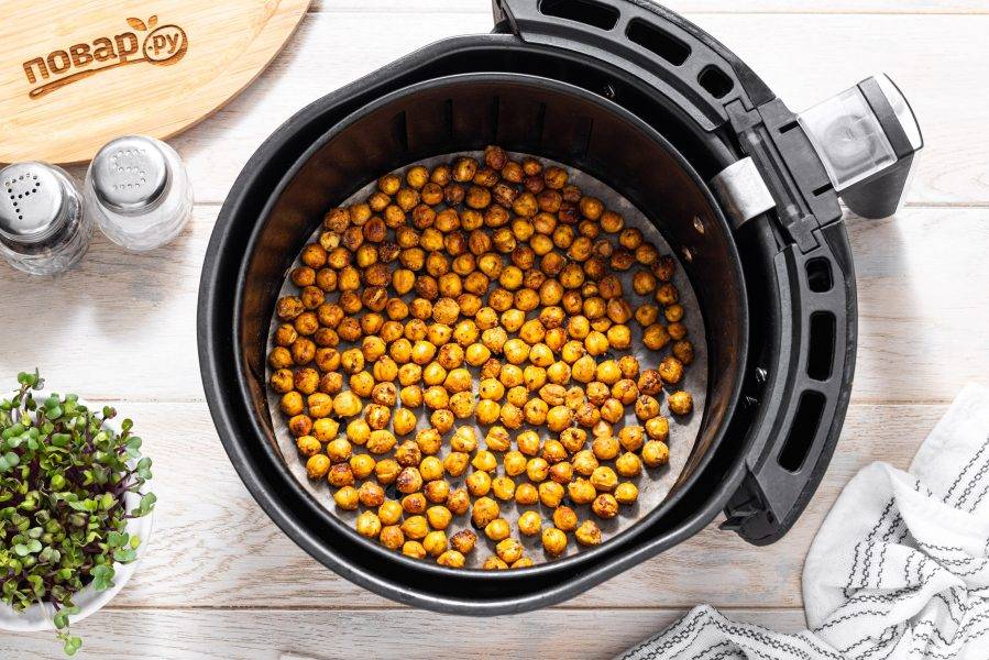 Давайте приготовим хрустящий печеный нут в аэрогриле. Его можно подавать как самостоятельную закуску, а можно добавлять в салаты или, например, в суп-пюре.
