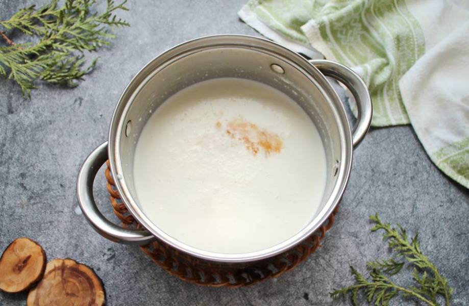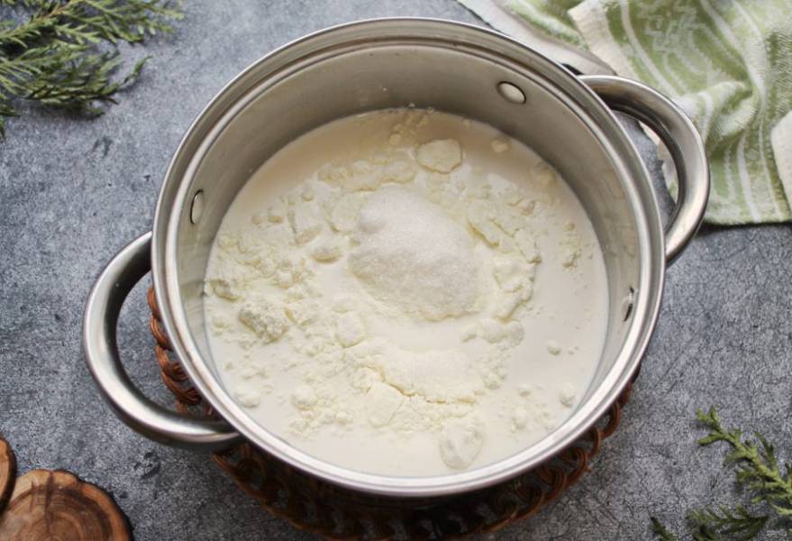 Всыпьте сахар и все хорошо перемешайте до полного растворения молока и сахара.