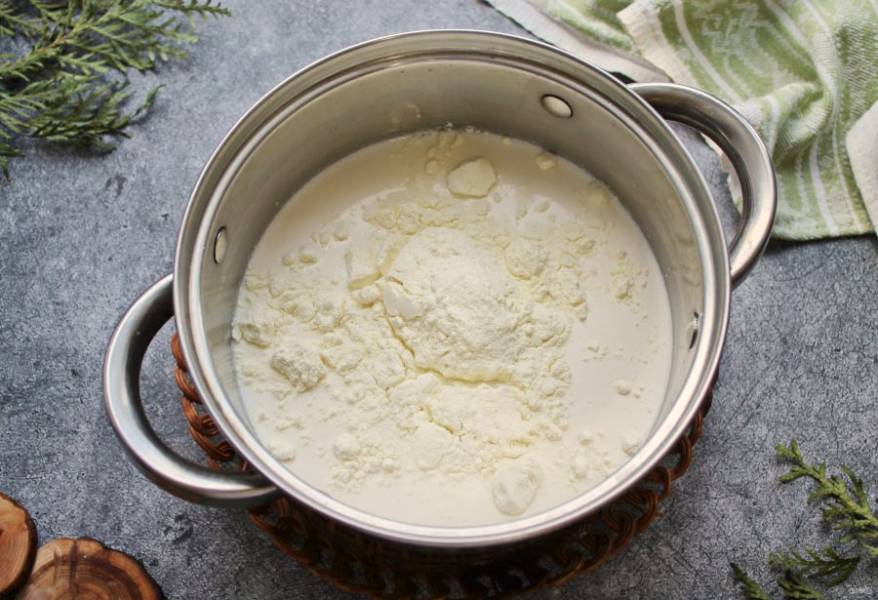 В кастрюлю налейте теплое молоко и добавьте сухое молоко.