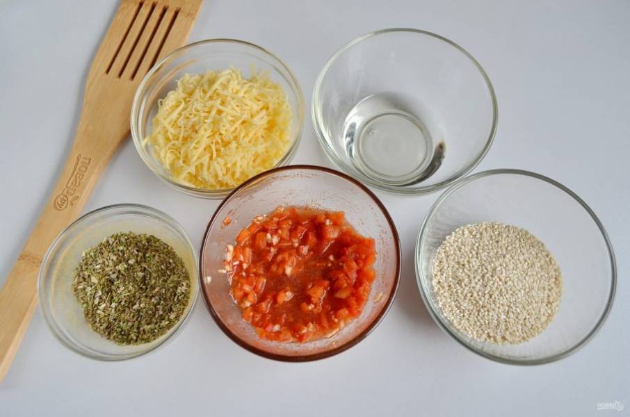 Нужно подготовить 4 разные панировки для хлеба: сырную, кунжутную, травяную и из сладкого перца. Как приготовить две последние? Я расскажу. В мисочке смешайте три вида трав: орегано, тимьян, майоран. Добавьте щепотку соли и перца молотого. Готово. Для последней панировки измельчите паприку и чеснок, залейте растительным маслом, добавьте молотую паприку и перемешайте. Можно добавить лимонную цедру.