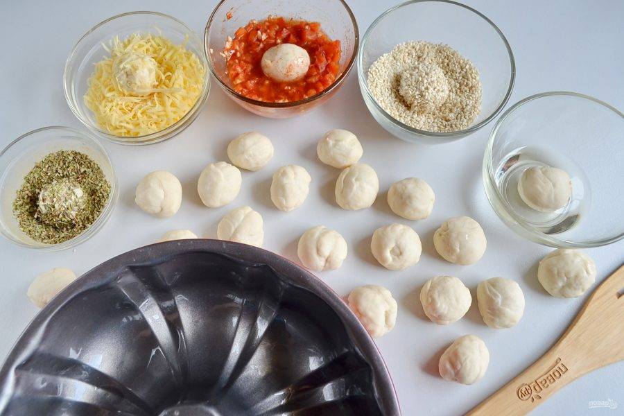Разделите хлебное тесто на части, количество не имеет значения. Каждую часть теста скатайте в шарик.
