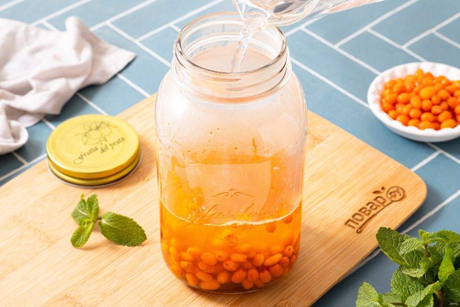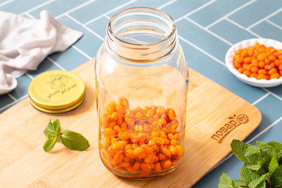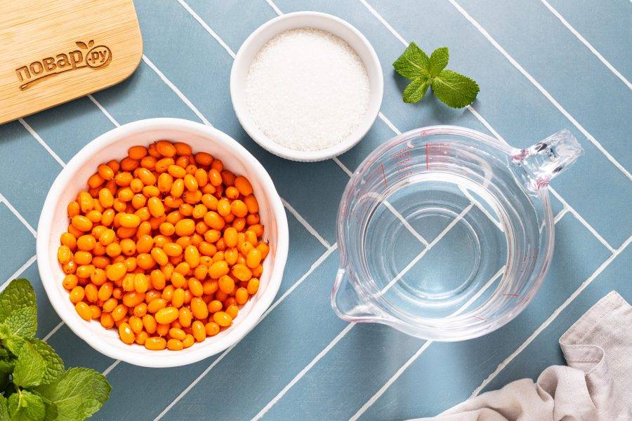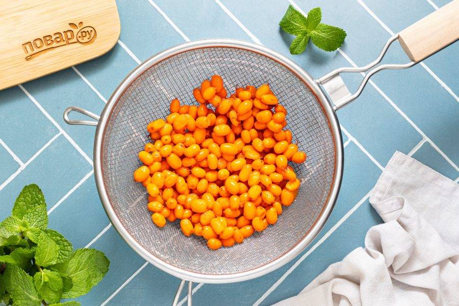 Облепиху отделите от веточек, переберите. Промойте в воде и откиньте на сито.