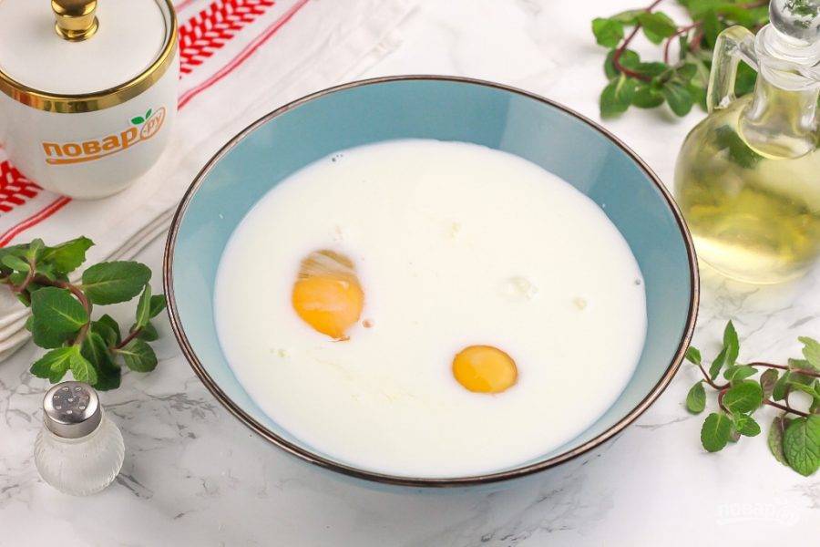 Влейте в емкость молоко. Оно может быть как холодным, так и теплым, но не горячим, чтобы яичная масса не свернулась.
