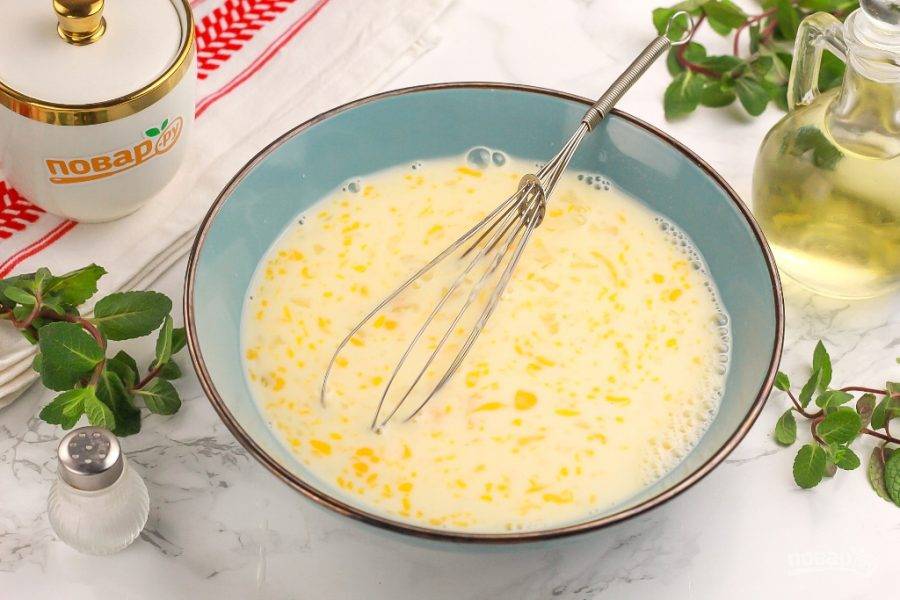 Взбейте венчиком примерно 1-2 минуты, вмешивая молоко во взбитые яйца. Можно это сделать с помощью миксера или блендера.