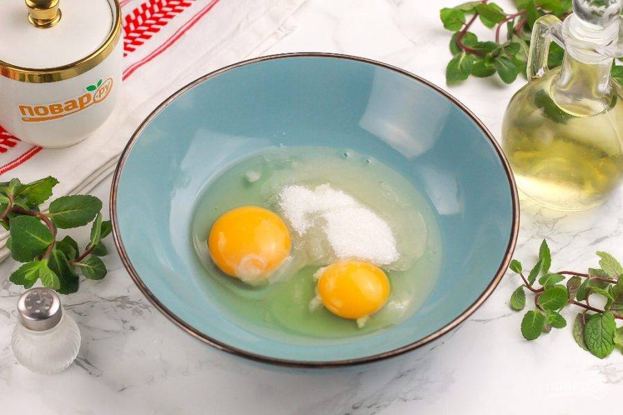 Вбейте куриные яйца в миску или салатник, всыпьте сахар и соль. На этом этапе можно добавить различные сладкие специи, пряности или натертую цитрусовую цедру.