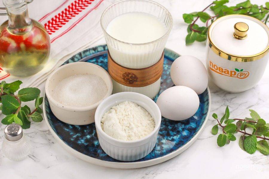 Подготовьте указанные продукты. Если куриные яйца крупные, то муки нужно будет немного добавить и наоборот. Молоко можно использовать любой жирности.