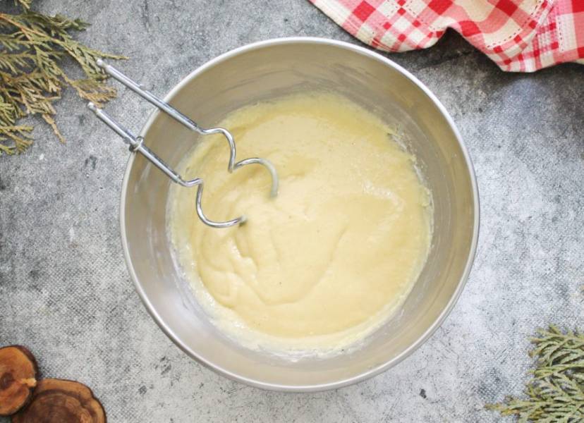 В миску просейте муку со специями и замесите тесто миксером на низких оборотах не менее 6-7 минут. Тесто будет липким, и тянуться за венчиками.
