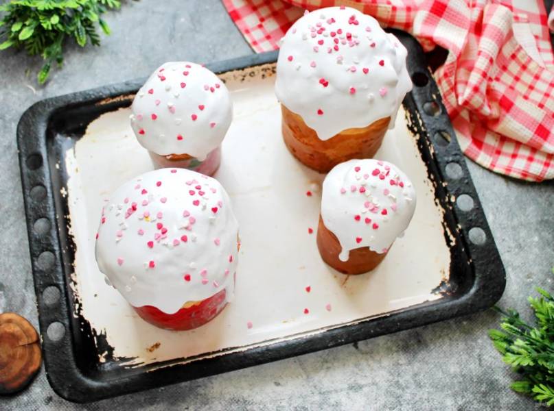 Готовые куличи извлеките из духовки и сразу нанесите готовую глазурь. Украсьте верх по своему усмотрению и оставьте до полного остывания.