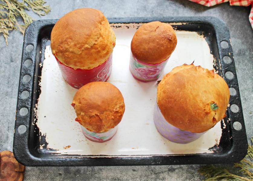 За 15-20 минут до конца подъема, включите духовку и разогрейте до 180 градусов. Установите формы с куличами на противень и поставьте в горячую духовку. Выпекайте в течение 20 минут, затем, чтобы не пригорел верх, покройте верх фольгой и запекайте еще 10-20 минут, до готовности.