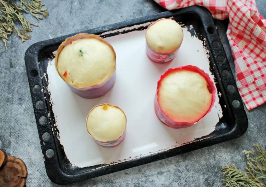 Покройте формочки с тестом чистым полотенцем и поставьте в теплое место для подъема. Тесто должно увеличиться в два раза и на это уйдет примерно 1.5-2 часа. Время будет зависеть от температуры расстойки.