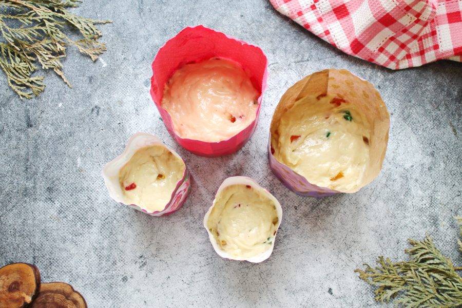 В формочки для куличей разложите тесто на 1/3 высоты, сформировав из частей шарики.