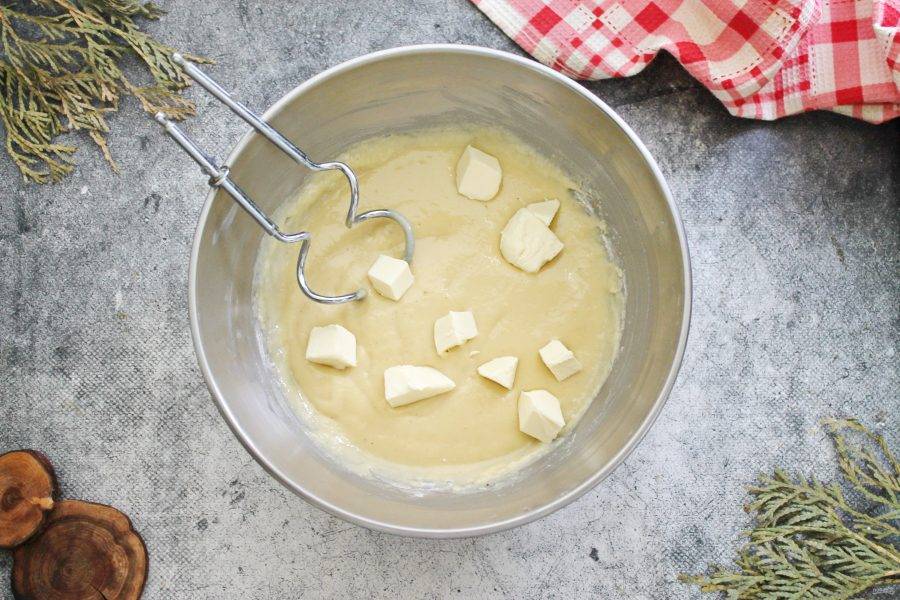 Холодное, но мягкое сливочное масло порежьте на мелкие кусочки и, продолжая взбивать тесто, частями добавляйте его в миску. Вымешивайте тесто в течение 8-10 минут.