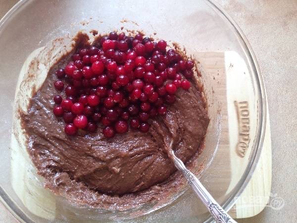 8. И размешиваем. В итоге получится достаточно густое тесто. Добавим клюкву и перемешаем, чтобы ягоды более-менее равномерно распределились в тесте.