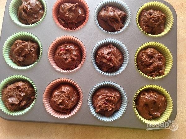 9. Раскладываем тесто по формочкам (я использовала бумажные формочки), теста хватит на 12 маффинов.