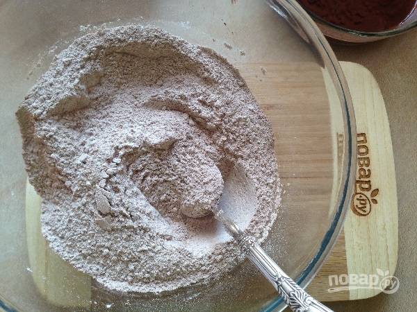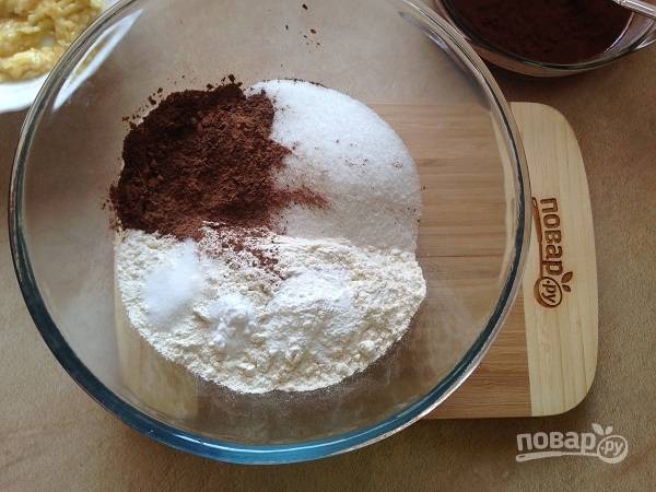 4. В миску насыпаем все сухие ингредиенты: муку, какао, сахар, соль, соду и разрыхлитель.