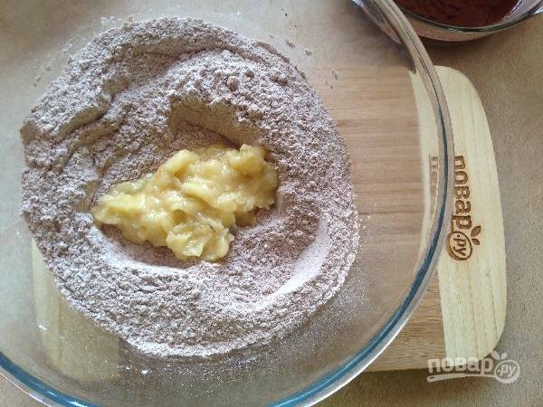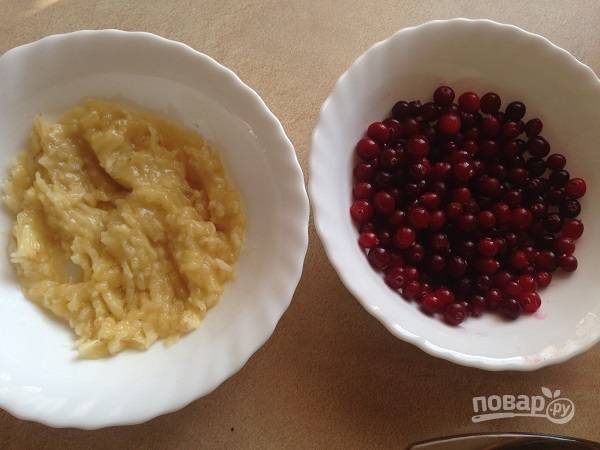 2. Банан или яблоки превращаем в пюре. Яблоки не стоит брать слишком сочные. Клюкву вымоем и обсушим. Если используете замороженную клюкву, надо, чтобы она разморозилась.