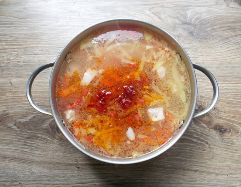 Выложите в суп зажарку из моркови с луком и тушеную свеклу, перемешайте.