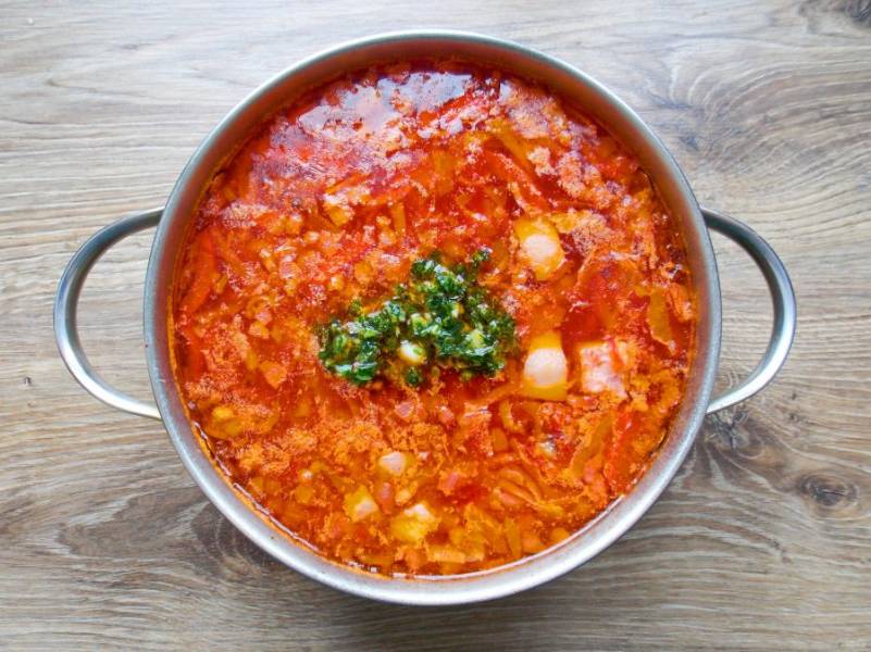 Добавьте зеленую кашицу в борщ и перемешайте.