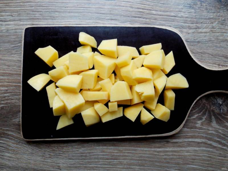 Картофель очистите и порежьте крупным кубиком или дольками. Бульон процедите и поставьте снова на средний огонь, доведите до кипения. Добавьте картофель.