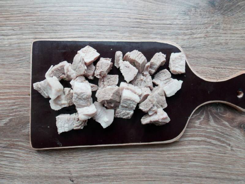 В кастрюлю налейте холодную воду и выложите порезанную на куски свиную грудинку. Добавьте в кастрюлю черный перец горошком и посолите. Доведите до кипения на среднем огне, убавьте огонь и варите при слабом кипении 1 час, снимая пену. Извлеките мясо и остудите.