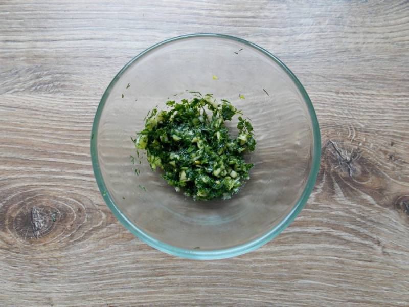 Зелень мелко порежьте, выложите в миску. Добавьте мелко нарезанный чеснок, оставшееся мелко резаное сало и перетрите в однородную кашицу.