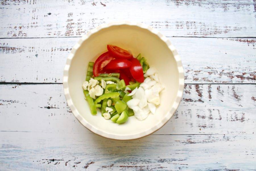 Помидоры порежьте на дольки, репчатый лук полукольцами, чеснок дольками. У перца удалите плодоножку и семена, порежьте соломкой. Выложите овощи в миску и посолите.