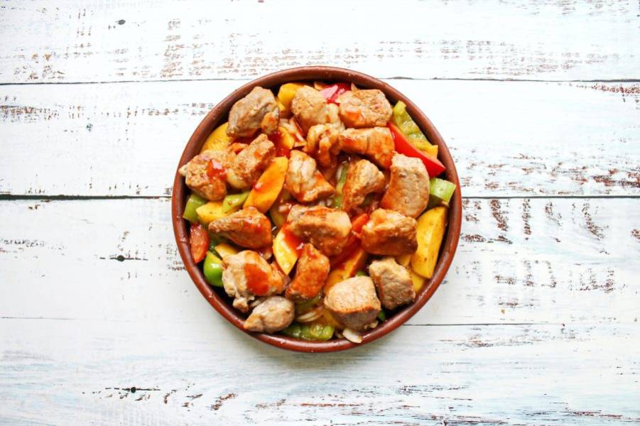 Поверх овощей выложите обжаренное мясо с маслом после обжаривания. Кетчуп разведите с водой и полейте мясо с овощами.
