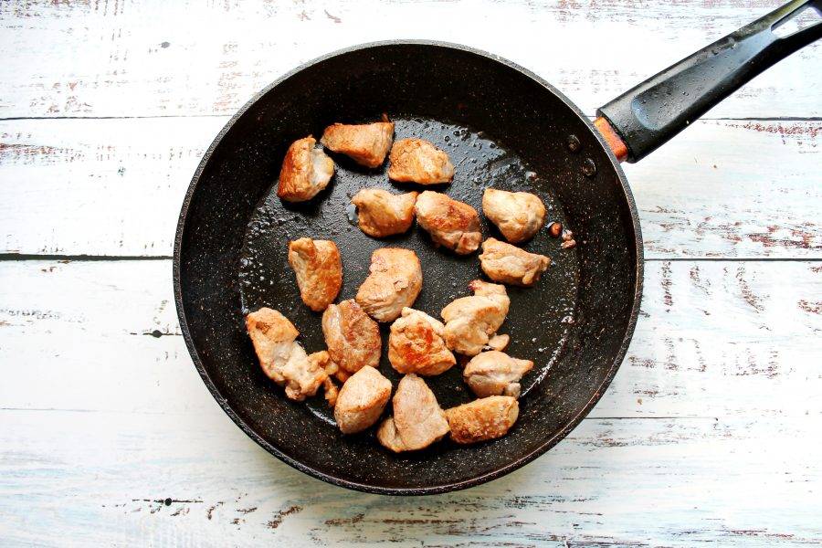 Свинину сполосните, обсушите и порежьте средними кусочками. Полейте мясо винным уксусом, перемешайте и оставьте на один час. В сковороде разогрейте растительное масло и обжарьте свинину на сильном огне до золотистой корочки.