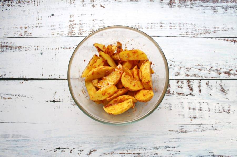 Картофель почистите и порежьте дольками. Выложите картофель в миску, посолите, поперчите, добавьте специи и перемешайте. Влейте растительное масло, перемешайте и дайте постоять 15 минут.