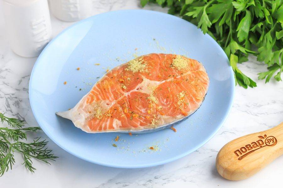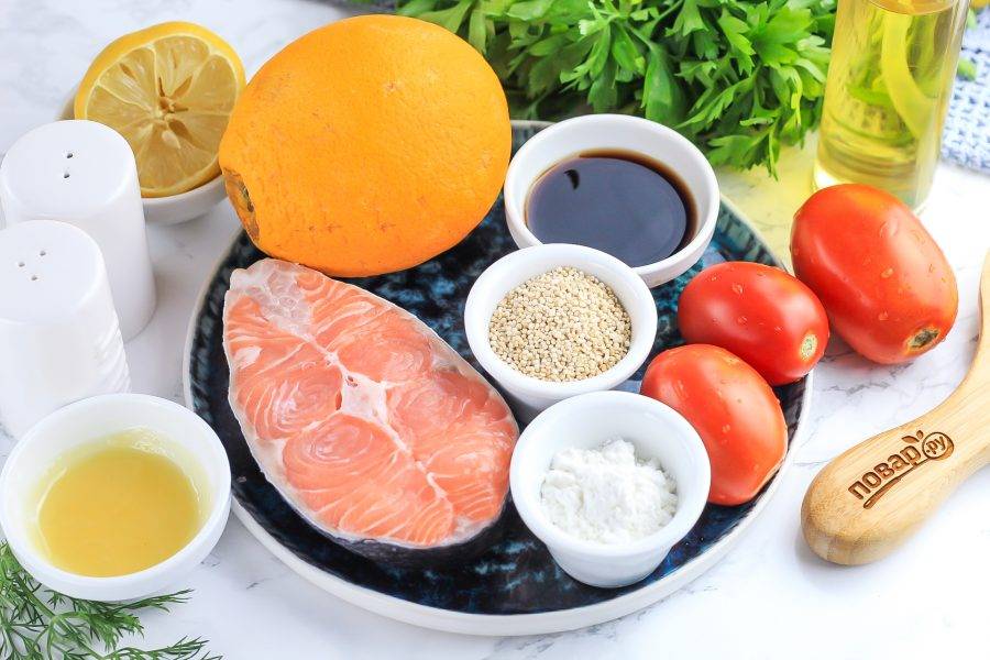 Подготовьте указанные ингредиенты. Апельсин промойте в воде, разрежьте пополам и выжмите сок. С лосося счистите чешую и промойте с обеих сторон, обсушите рыбу бумажными салфетками.