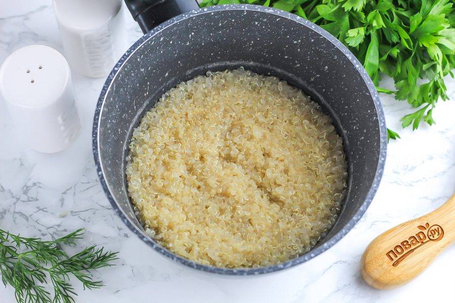 Промойте киноа в холодной воде несколько раз и высыпьте в казан, ковш. Всыпьте щепотку соли и залейте кипятком. Отварите не менее 15-20 минут на среднем нагреве.