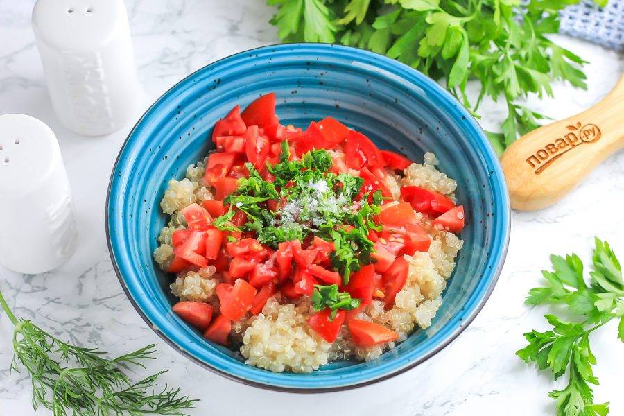 Остудите киноа. Томаты промойте и вырежьте зеленые сердцевинки. Нарежьте мелкими или средними кубиками, добавьте в кашу вместе с измельченной зеленью, солью и молотым черным перцем.