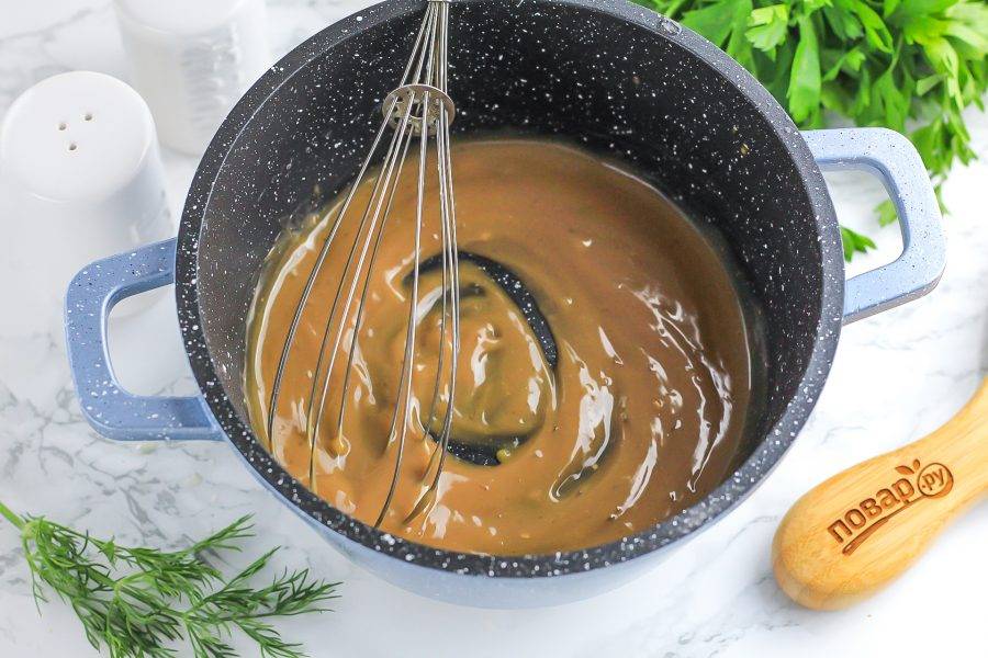 Прогрейте смесь на плите, включая умеренный нагрев. Помешивайте соус венчиком, пока он слегка не загустеет, примерно 3-4 минуты.