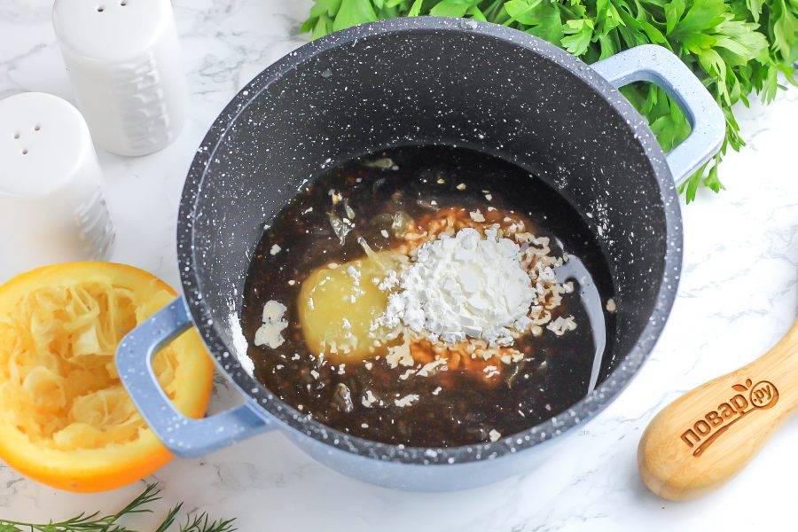 В ковш или казан выложите мед, влейте соевый соус, добавьте крахмал, лимонный сок и все тщательно перемешайте.