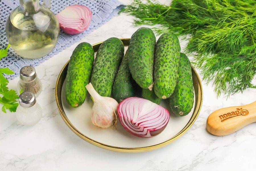 Подготовьте указанные продукты. Огурцы переберите, промойте в воде, удаляя шипы, пыль и т.д. Срежьте хвостики с обеих сторон плодов.