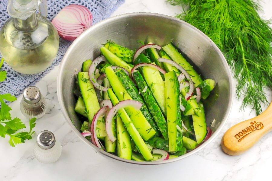 Тщательно перемешайте всю массу, чтобы зелень и специи равномерно по ней распределились. Закройте емкость крышкой и оставьте при комнатной температуре на полчаса. Либо выложите в банку, пищевой контейнер и плотно закройте крышкой. Огуречная нарезка благодаря соли выделит много жидкости. Время от времени потряхивайте емкость, чтобы огурцы равномерно просолились.