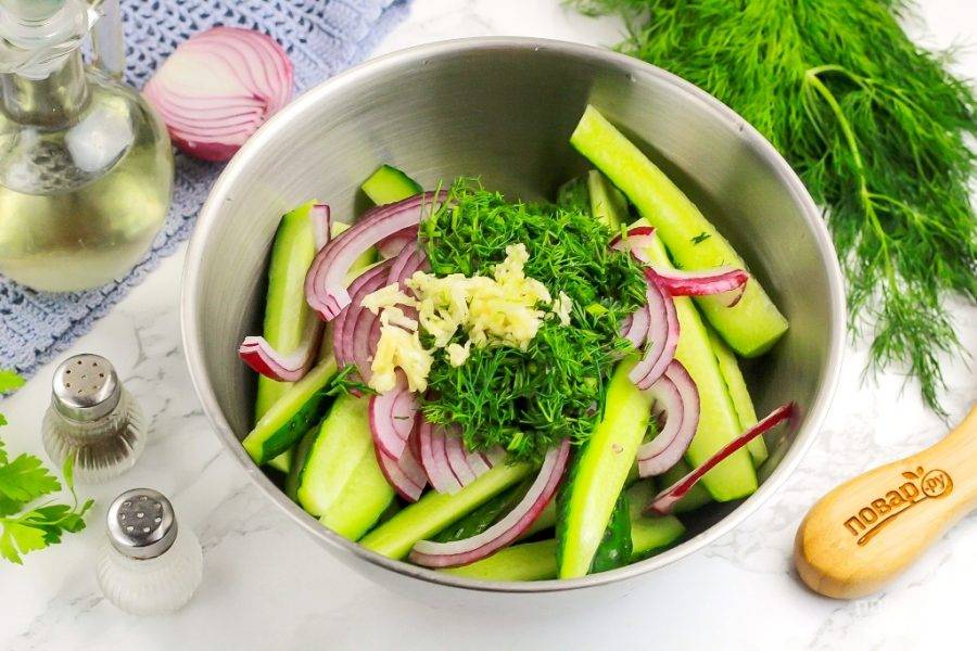 Промойте укроп. Нарежьте его мелко, а половину красной луковицы — полукольцами и добавьте в емкость к огуречной нарезке.