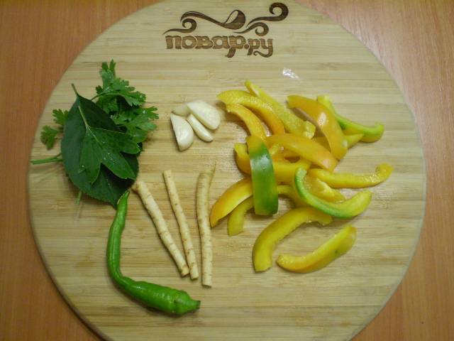 Уложите огурцы, болгарский и горький перец, корешки хрена.